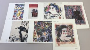 例えば、1949年の《女人観世音板画巻》は晩年まで何度か摺った作品ですが、墨刷りそのままのものもあれば、後に1969年に摺った際には裏彩色をして色鮮やかに仕上げています。《御鷹揚ゲノ妃々達》は、1963年に弘前市民会館大ホールの緞帳原画として制作したものですが、1964年には改刻し配色を変え、同年の第六回現代日本美術展には《道標の柵》と題名も変えて出品しています。